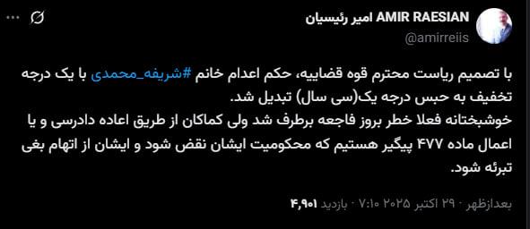 بر اساس این تصمیم، حکم اعدام شریفه محمدی، فعال کارگری ۴۶ ساله، لغو شده و او اکنون دوران محکومیت خود را در زندان لاکان رشت سپری می کند.